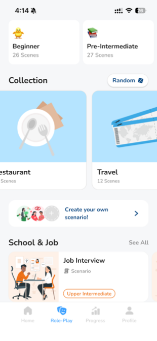 对应,Learna所提供服务为“应急式学习”。它把学习场景拆成13个主题:医院、法庭、银行、面试......每个场景都有AI扮演的角色前台、医生、面试官,和用户实时对话。