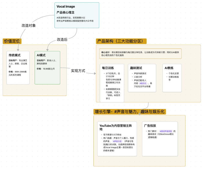 借助于声音与魅力/性别的关联,以及“测试声音类型”的趣味测试,Vocal Image获取用户并以19.99美元/月的“平替方案”实现1200万美元的ARR。