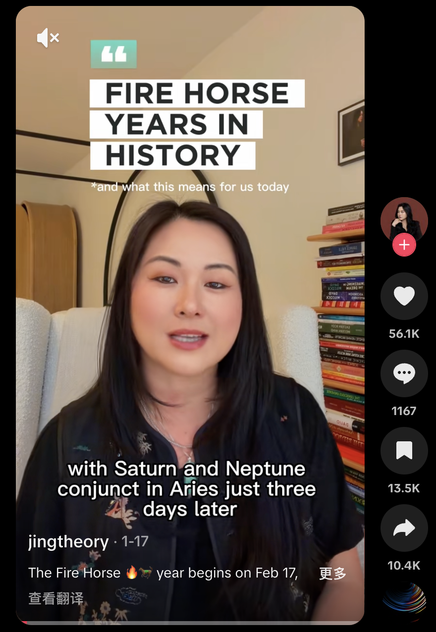 这个视频在TikTok上拥有超过56.1k点赞,博主说火马年的力量十分强大,它将标志着人类历史上的一个重要时刻。