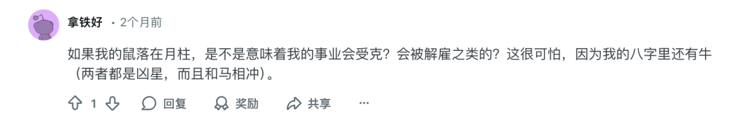“如果我的鼠落在月柱,是不是意味着我的事业会受克?我的八字里还有牛,两者都是凶星。”这种提问太专业了,没有三十年道行实在难以解答,祝福他早点探索出答案吧。