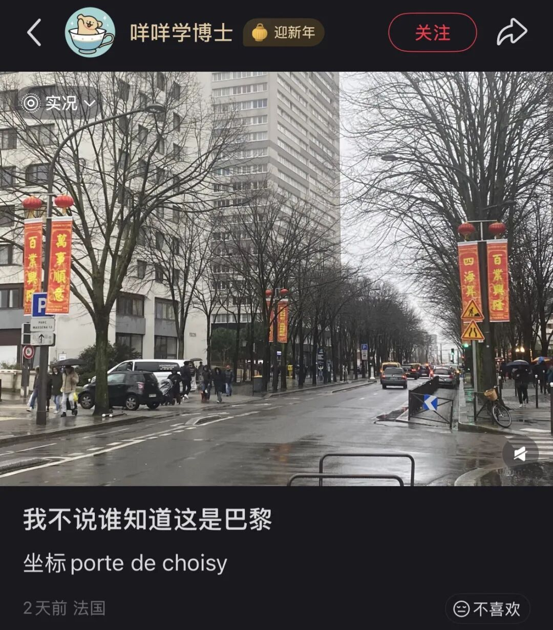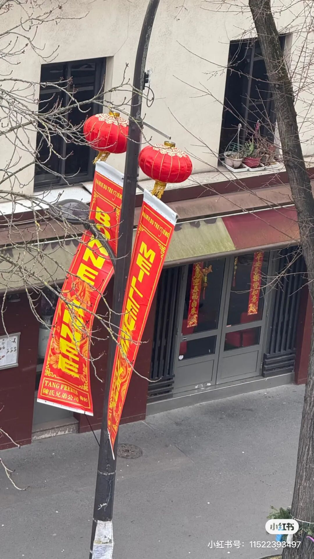 这是巴黎,路灯杆上整整齐齐地挂着红色对联,顶上还装饰着圆滚滚的红灯笼。评论区热评:果然,巴黎是家。