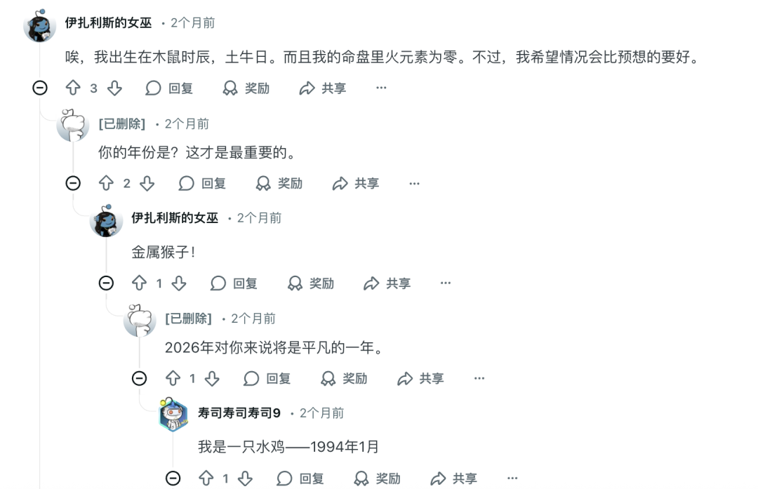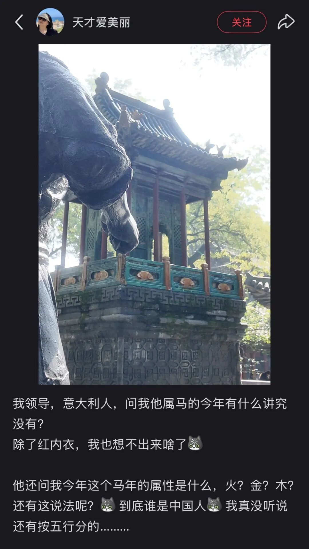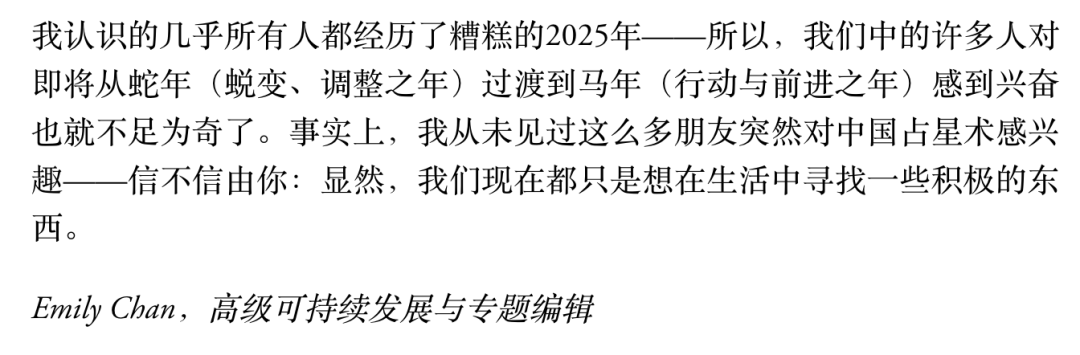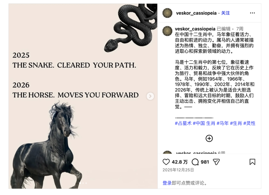 “2025年:蛇。为你扫清障碍。2026年:马。助你前行。”Instagram上这条片汤话都有40多万点赞,让人有种误入《相亲相爱一家人》群聊的错觉。