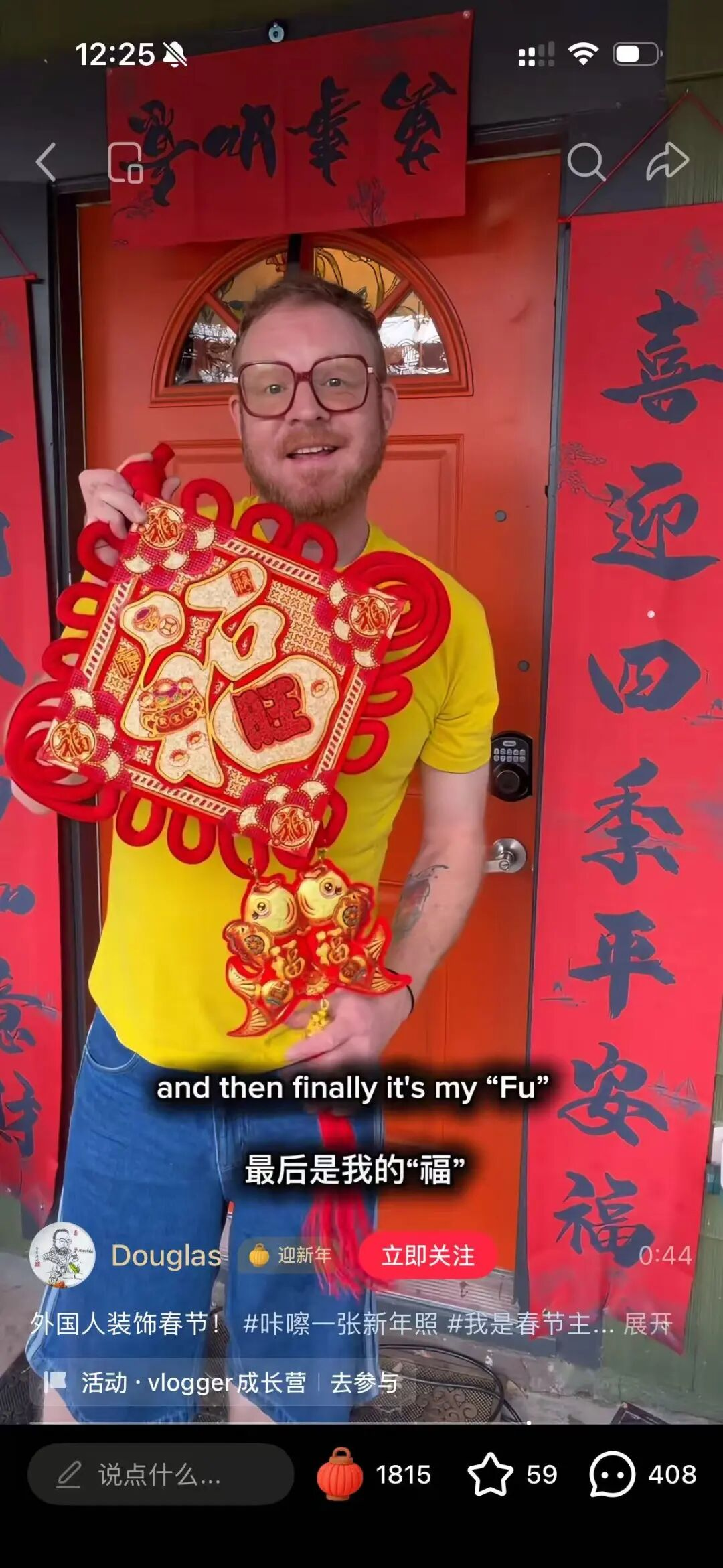 贴对联对老外来说是个技术活,一顿操作猛如虎,研究了半天横批还是贴反了哈哈哈哈哈。