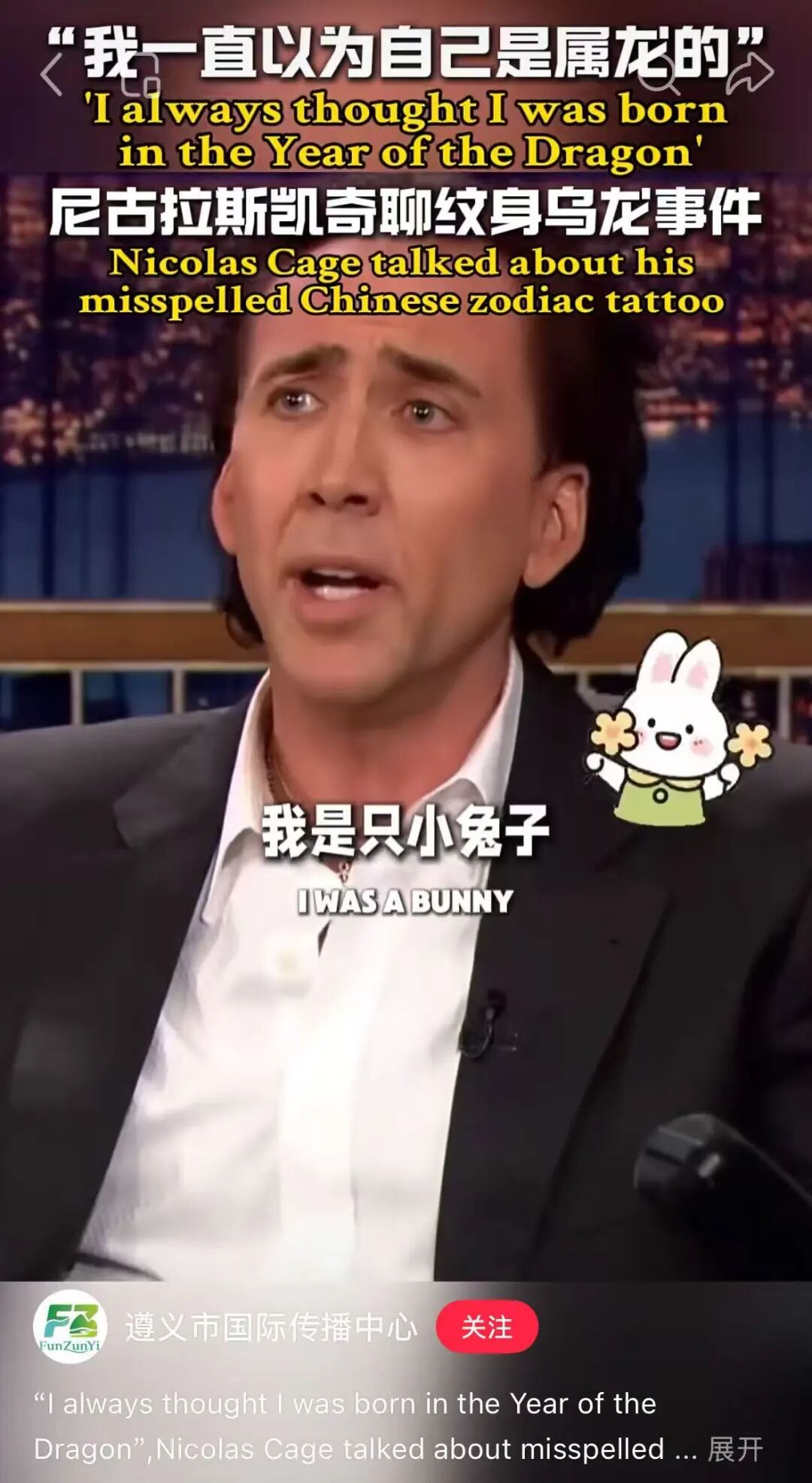 尼古拉斯·凯奇的生日是1月7日,他曾经以为自己是龙年出生的,在背上纹了一条龙纹身,还买了个龙壁炉。后来他才知道按照中国生肖的计算方法,过了除夕才算龙年,他其实属兔。