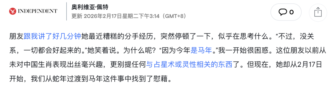 评论区也有很多类似的观点,“我相信今年将是最具变革性的一年”,外媒上还有一篇名为《为什么千禧一代认为火马年会拯救他们?》的报道。
