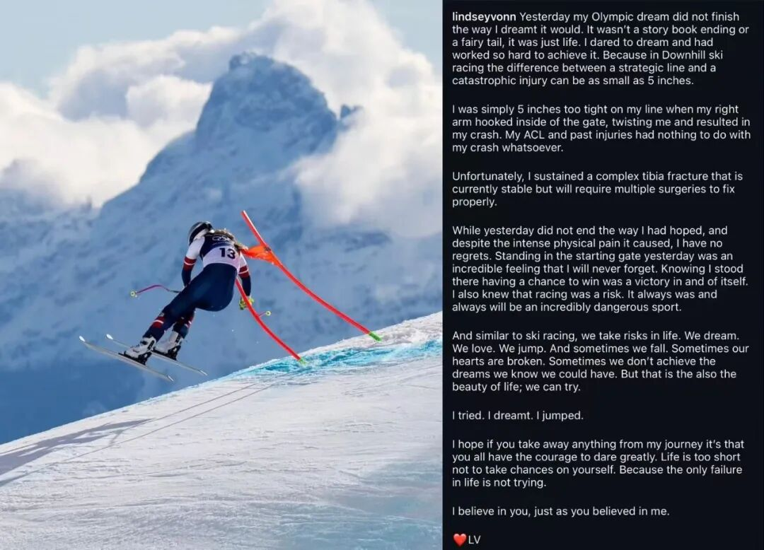 当她痛苦的尖叫声从现场收音传出来时,不管是雪道旁等待的人群、转播间的解说、还是弹幕里的网友,都在祈祷着林赛·沃恩的平安,也成为本届冬奥会最揪心的时刻。