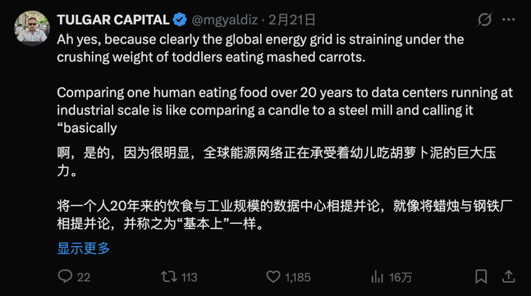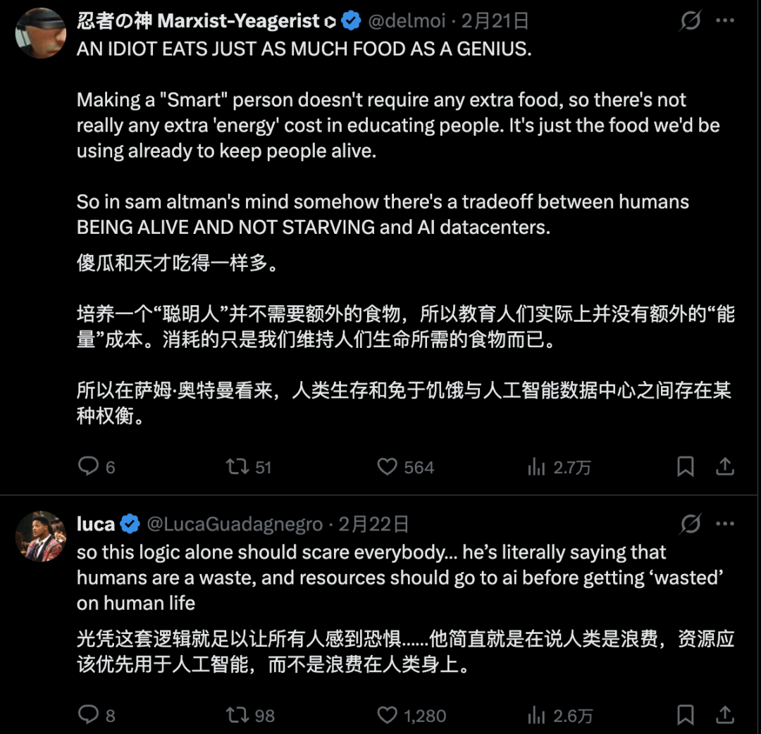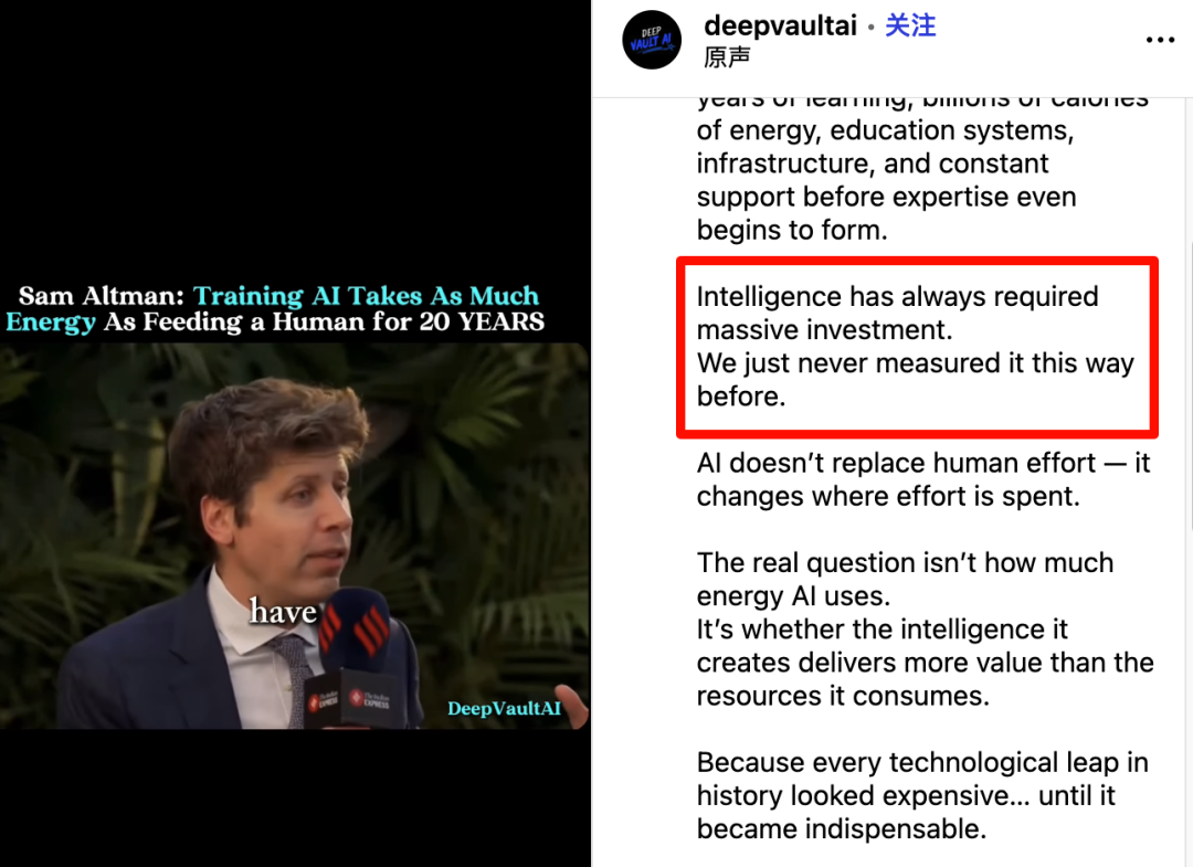 人一生的自然进化中,不仅有产出,还有情感、教育、成长的喜悦,这些能量计算不来,在舆论场上,这点被放大。一个油管博主打出标题「OpenAI CEO Argues Energy Is More Wasteful On Humans Than AI,Goes Very Poorly」,说Altman的言论进行得很糟糕。