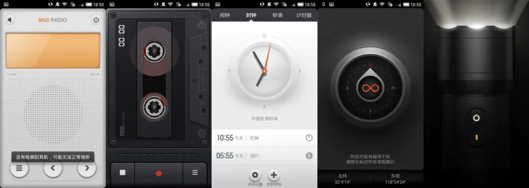 4G版本的红米Note出场即搭载MIUI 6,尽管在上一部分中我对MIUI V5并不吝惜溢美之词,但很可惜的是随着iOS 7转向全面扁平,当时的小米也选择紧跟大哥的步伐。MIUI 6在UI上的革新几乎可以说是摸着苹果过河,完全压扁的图标,壁纸大胆的色块拼接,以及在系统应用和通控中心内大量使用的毛玻璃模糊,构成了十分年轻又大胆的设计语言。不过由于红米Note本身屏幕够大,文字和图标并没有丧失太多可读性,录音机、指南针、时钟等系统应用的扁平化设计也沿用到MIUI 9/10,成为了很多用户对安卓机器UI的回忆,也构成了当年的我对于手机系统的最初印象。相较于MIUI V5,MIUI 6还有一点比较重要的革新是开始有意识地让系统动起来。尽管动画的表现形式并不是如今大家所熟悉的非线性动画,但是例如时钟App里的切换动画,电源菜单里的logo动画,天气App里的刷新动画等等,都是彼时在安卓机器中并不常见的设计,连贯的动画本质上也是上文提到的示能性在工程实现上的延续。