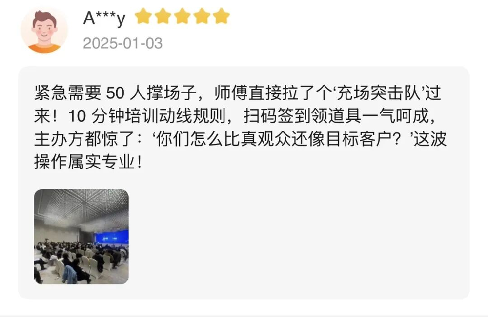 活动主办方发现活动到场观众太少,直接下单调来大量跑腿小哥扮演观众。