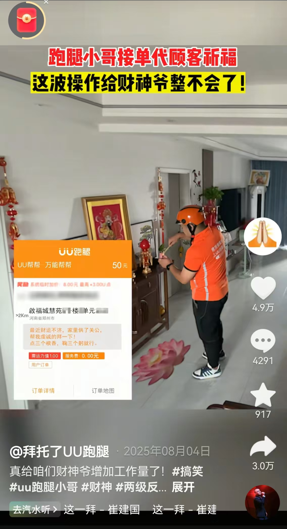 小伙儿给财神爷们发彩票。小红书博主@沈浪视频截图。