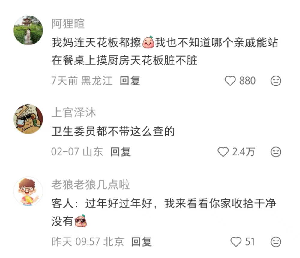 天花板上、电视和冰箱背面、沙发底下……这些不见天日的领域,在家中长辈的眼中,都会面对亲戚朋友们全面的检视。