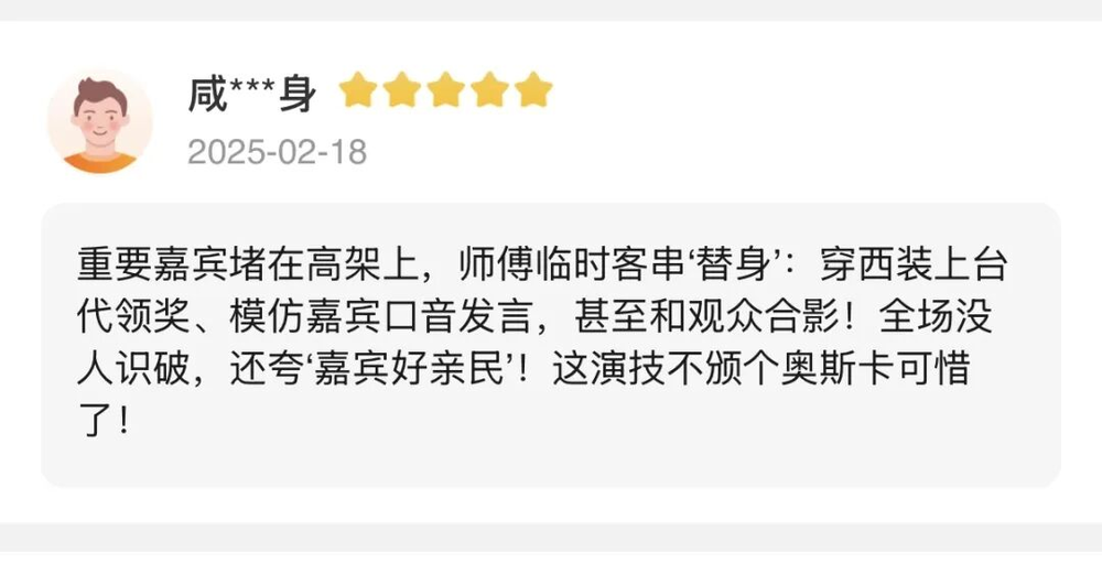 重要嘉宾堵在高架上,跑腿小哥临时客串,穿西装上台代领奖,全场没人识破。“这演技不颁个奥斯卡可惜了!”