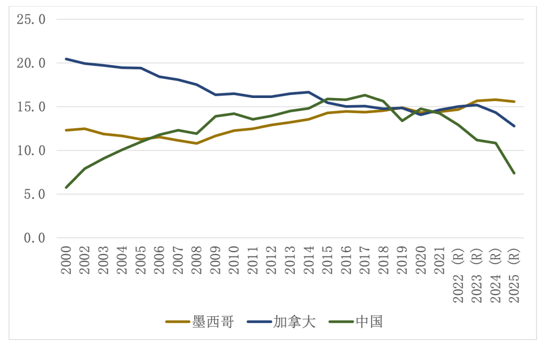 图1.中加墨三国同美双边商品贸易情况,2000-2025
