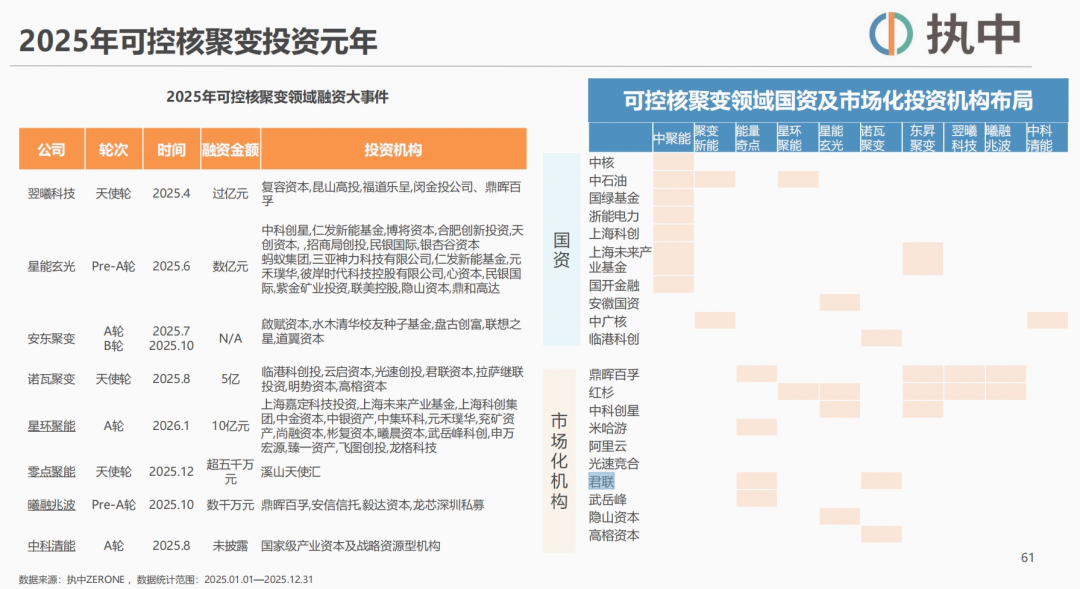 统计数据也印证了这些个体感受。据财联社创投通—执中数据,2025年至今,国内可控核聚变领域共计发生13起融资事件,涉及12个项目。头部效应则体现在,背靠中核集团的中国聚变能源有限公司,集中了超过100亿元的各方出资;星环聚能、诺瓦聚变、中科清能等项目的融资额也达到5亿元以上的规模,赛道内单个项目的融资额不断被刷新。