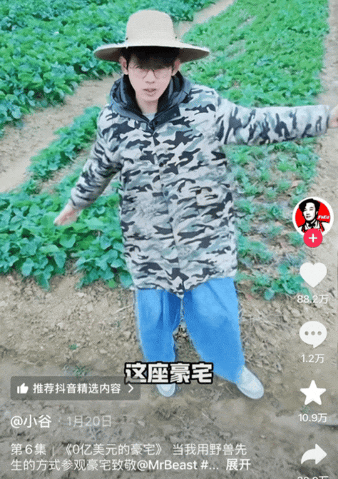 最直观的例子是,一位叫@小谷的大学生回村之后整了个大活:用野兽先生的方式参观自家老宅。