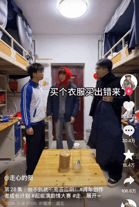 像是整活小会期间,最流行的宿舍扮演视频。表面上看吧,是几个人在胡闹,细品一下,却全是技术含量,能把那股精髓拿捏住了。