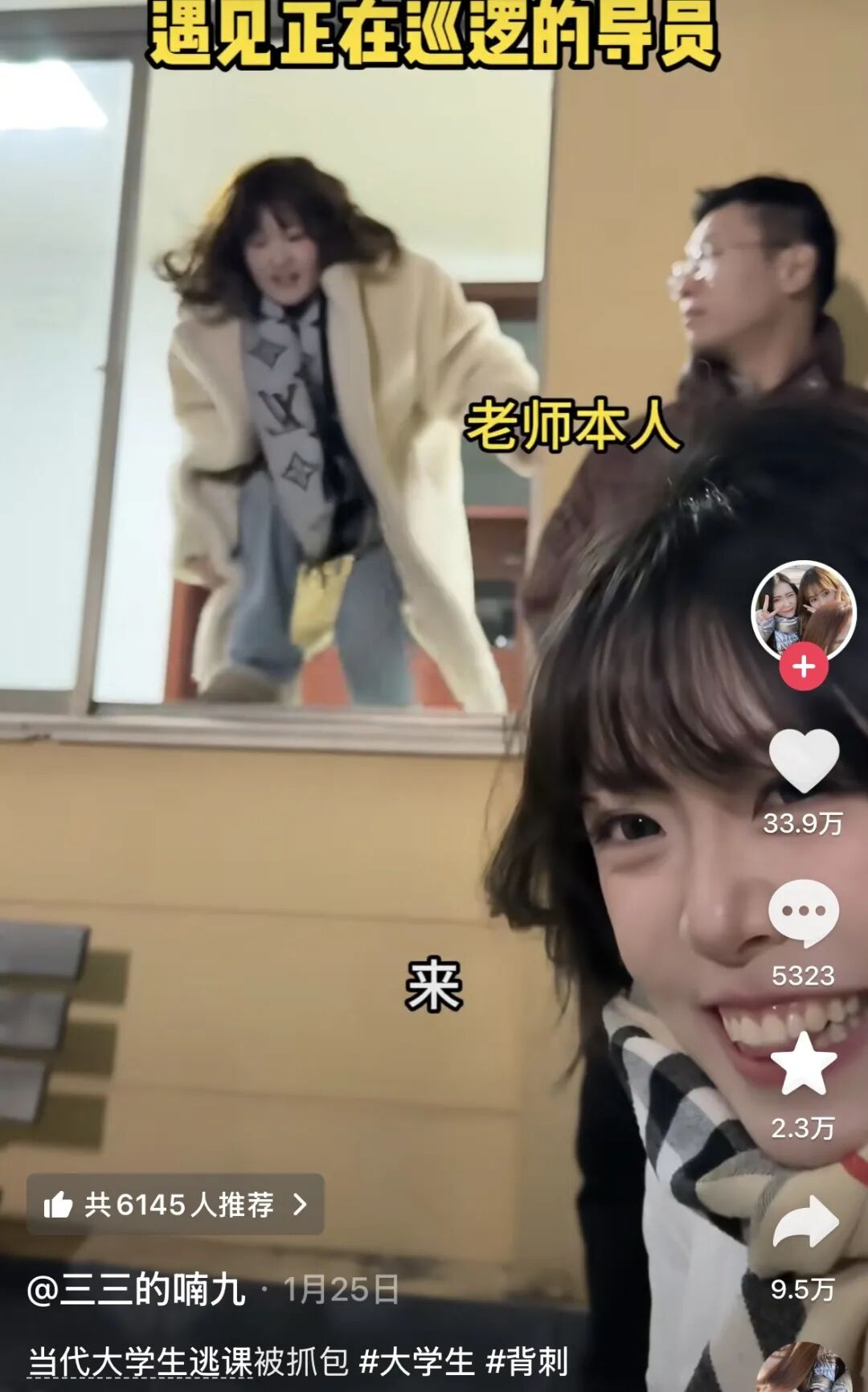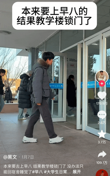 有人就用一出极其丝滑的哑剧,巧妙地表达了早八不想上课的痛苦,与教学楼大门展开了一场顶级拉扯,暗示大伙读书可不兴走旁门左道。