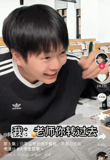 此次小会中诞生的整活头子@阿水不紧张,创作的爆款“打小抄”剧场也是同样的苦中作乐,疑似被监考老师打晕前产生的幻想。