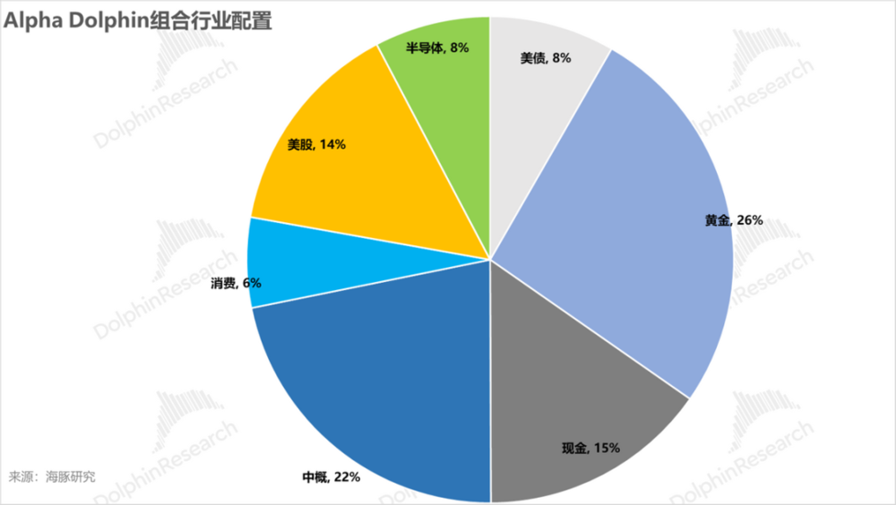 Alpha Dolphin虚拟组合共计持仓18只个股与权益型ETF,其中标配7只,其余低配。股权之外资产主要分布在了黄金、美债和美元现金上,权益资产与黄金/美债/现金等防守资产之间大约50:50。