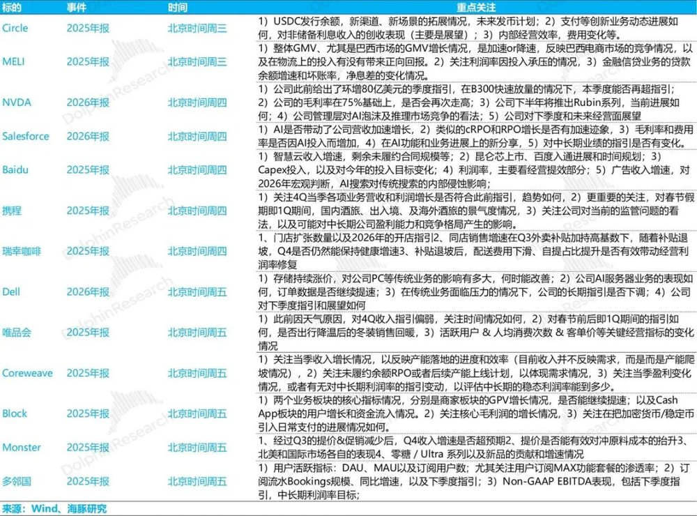 重点关注宇宙股英伟达、被摧残的软件股龙头Salesforce;而中概资产重点关注百度(昆仑芯和Robotaxi进展)、携程(关注对春节消费的指引,以及对2026年服务消费的判断);瑞幸咖啡主要关注在持续的红包大战下,现制茶饮和咖啡饮料的利好力度。
