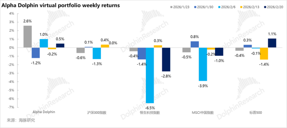 上周,海豚研究虚拟组合Alpha Dolphin未调仓。当周收益0.5%,沪深300不开盘,跑赢MSCI中国指数(-1%)、恒生科技(-2.8%),但跑输标普500指数(+1.1%)。