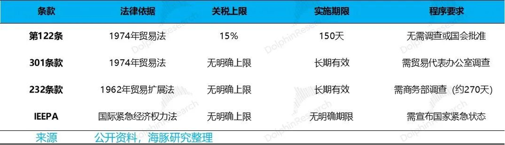 其逻辑是:用IEEPA搭建好的税率表可以作为“目标状态”,再通过301调查(针对不公平贸易)、232调查(针对国家安全)和122条款(针对国际收支失衡)等现成工具,一项或多项组合,将关税“搬运”到新的法律基础上。