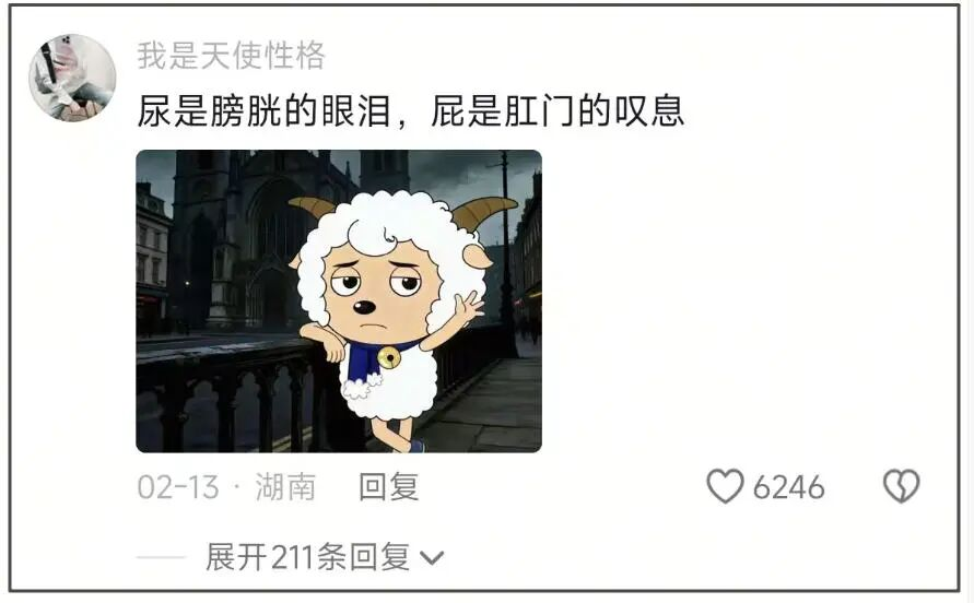 大过年的,眼泪也不准落单,于是大家开始创造不喜羊羊。背景一定得是伦敦,因为伦敦总是下雨,而其延续欧洲传统的经典收费厕所,让哪怕是一只羊的屎尿屁,也成了悲怆的文案。