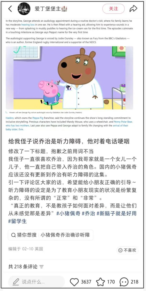 但在本月初,制作组为了铺垫三月播出的乔治衍生剧,展示了佩奇一家带乔治去体检,结果意外发现原来他一直有听力障碍,必须靠助听器辅助。