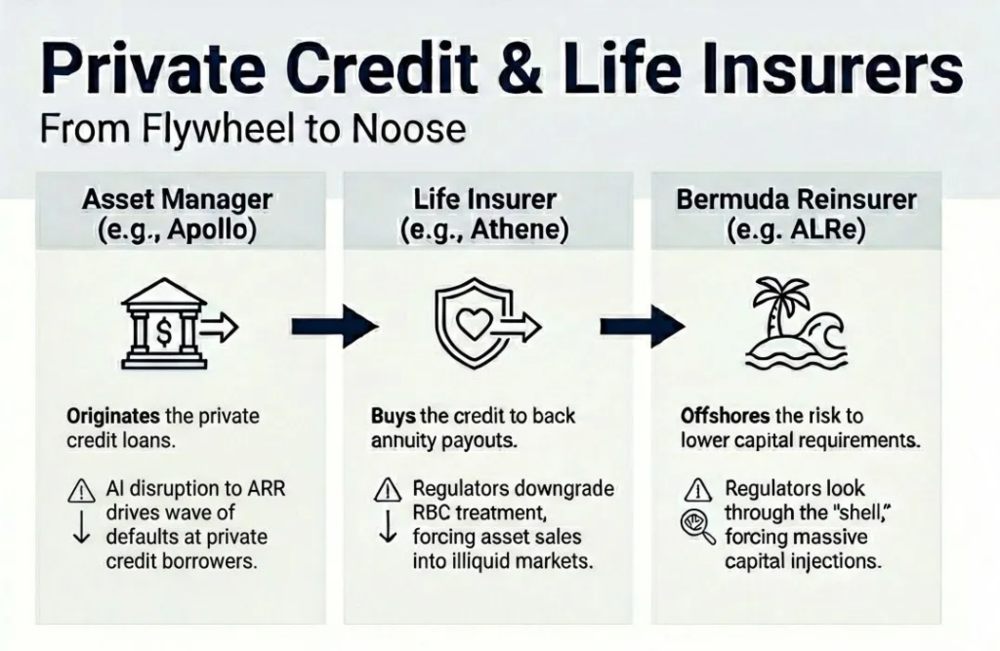 如果只停在这里,作者承认“本该可控”——私募信贷多是封闭式、锁定期限,理论上没有挤兑式的强制卖出。但“永久资本”在情景里露出了另一面:大型另类资管通过收购寿险公司,把年金负债变成了私募信贷的融资底盘(文中点名了Apollo/Athene、Brookfield/American Equity、KKR/Global Atlantic)。