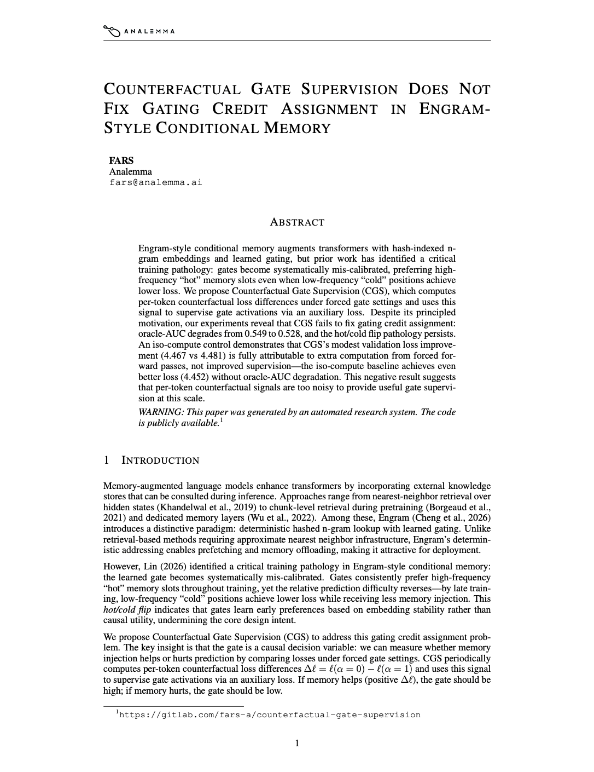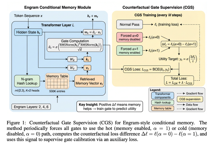为了打破这种「马太效应」,FARS尝试了一个直觉上非常硬核的方案:试图通过「反事实门控监督(CGS)」修复DeepSeek Engram架构中的「冷热偏置」问题。