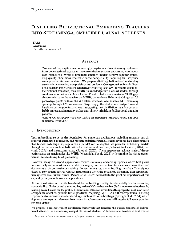 FA0042的解法非常工程导向——训练阶段用双向拿质量,推理阶段用因果保效率。具体路径是先训一个双向teacher,再把能力蒸馏进causal student。为了避免直接切双向带来的分布漂移,论文还引入了刚发布不久的GG-SM做渐进过渡。