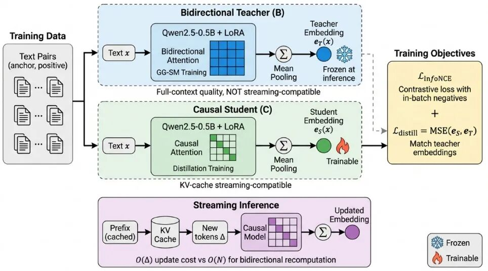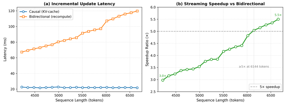 双向注意力质量高,但会破坏KV-cache;因果注意力能流式推理,但表示能力吃亏。