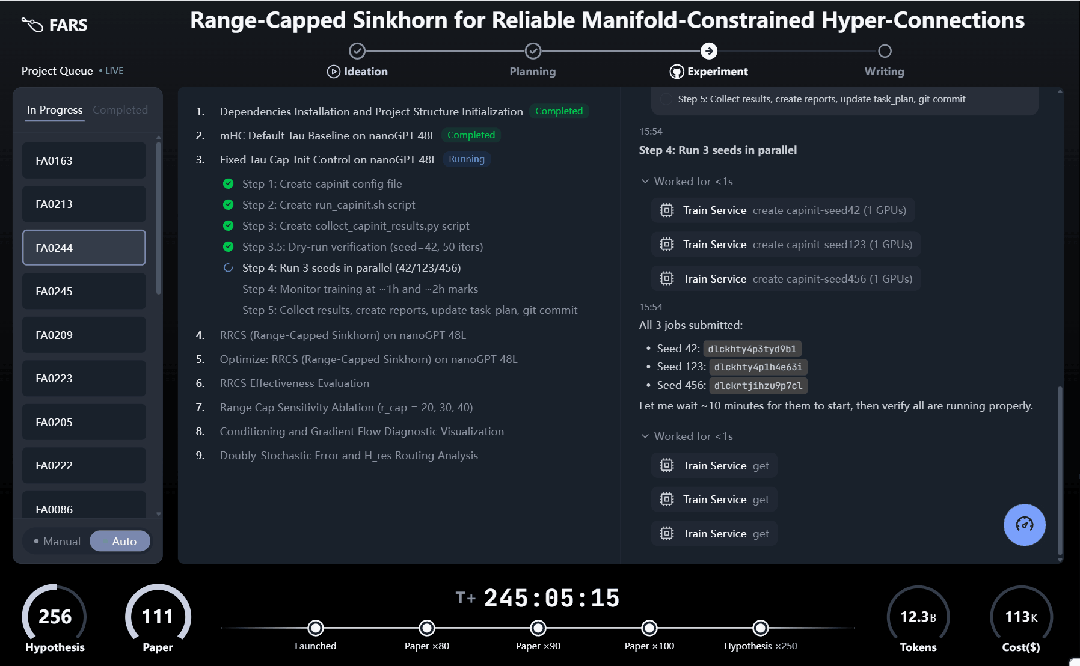 从实时运行界面可以直观看到,FARS以项目队列的方式并行推进多个研究任务。每个课题依次穿过Ideation→Planning→Experiment→Writing四个阶段,流程高度模块化,呈现出明显的「科研装配线」特征。