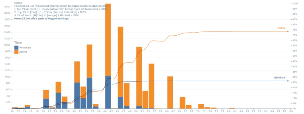为此,研究团队使用斯坦福大学开发的AI审稿系统Agentic Reviewer(paperreview.ai),按照ICLR的评审标准,对这100篇论文进行了统一打分。