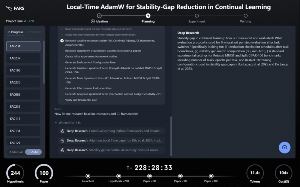 FARS实时运行界面:从假设生成到论文写作,自动化科研流水线首次以可观测形态完整展开。
