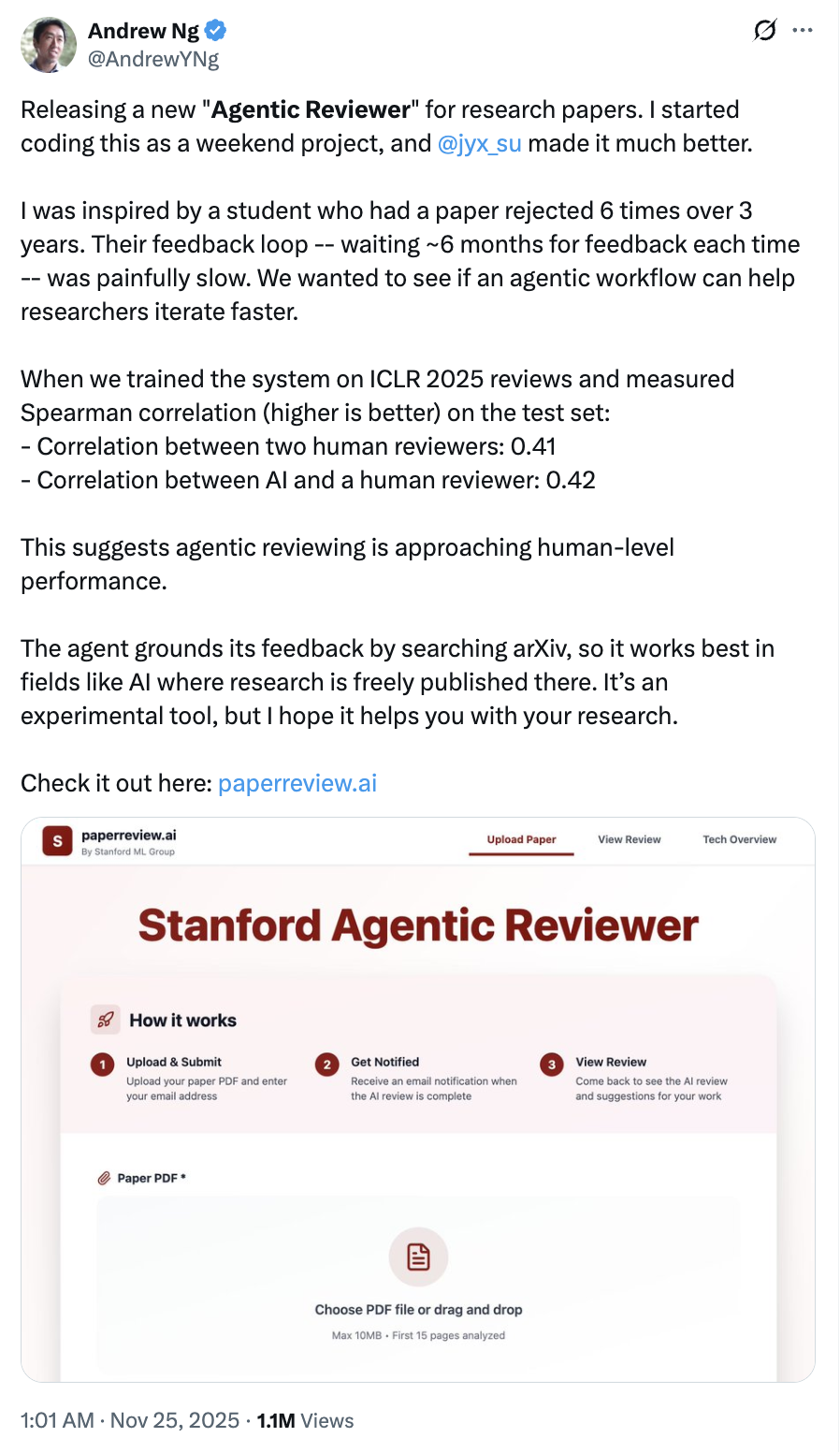 开发者在ICLR 2025审稿数据上做了对比评测,使用的是Spearman相关系数。人类vs人类:0.41;AI vs人类:0.42。开发者认为agentic reviewing正在逼近人类水平。
