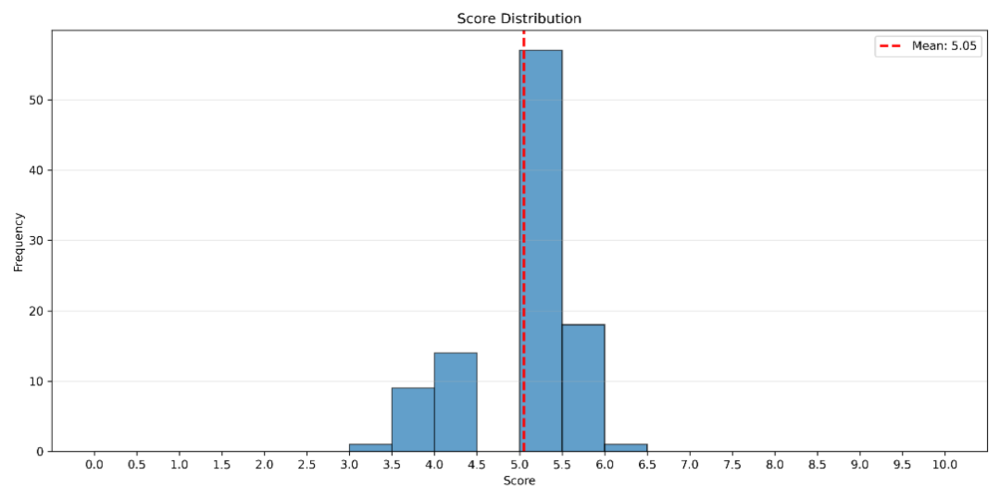 从整体评分结果来看,FARS产出的100篇论文中,平均得分为5.05(区间3.0–6.3)。