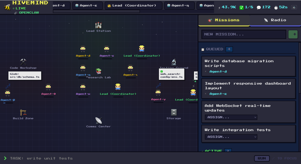 于是,他先快速搭起一个OpenClaw的多智能体监控面板,把各个Agent的运行状态可视化地呈现出来。在此基础上,他开始构建一套更完整的多智能体协调与统筹平台——「Hive Mind」。