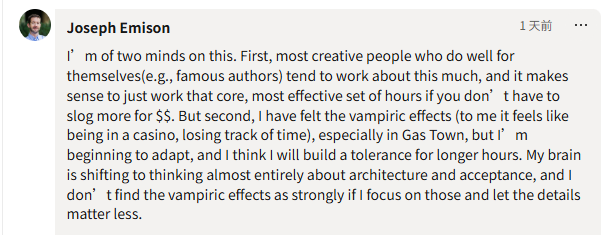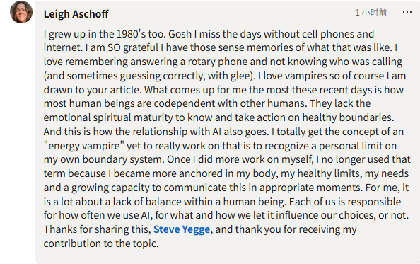 他不再将问题归结为“AI是吸血鬼”,而是归结为“我需要更清楚地知道自己的极限在哪里”。