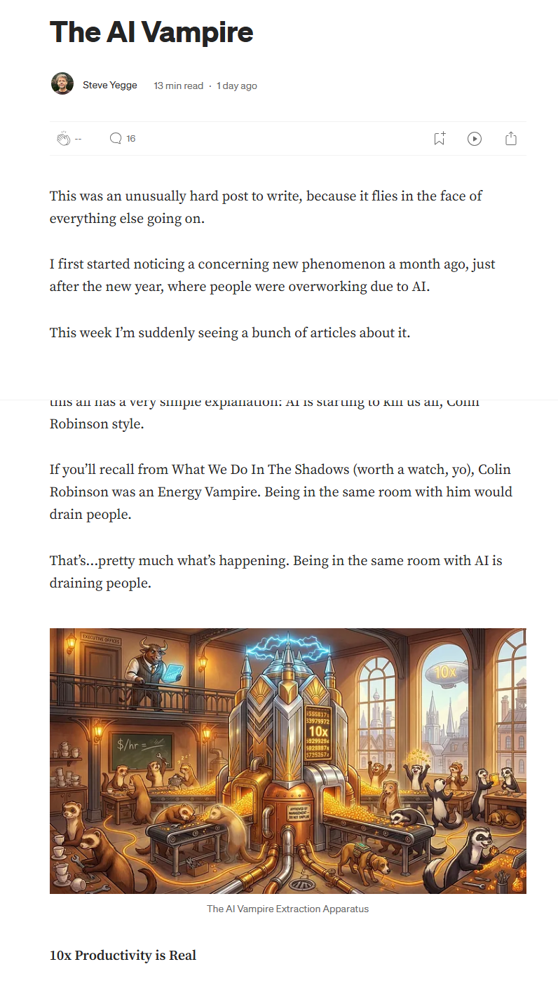 耶格指出,当生产力提升超过约2倍时,一种被他称为“吸血鬼效应”的现象便开始显现,技术不再仅仅是工具,而开始反向塑造使用者的工作节奏和心理状态。