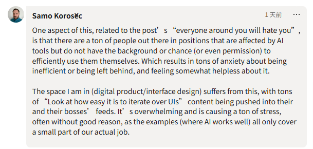 他指出,社交平台上充斥着“一分钟生成十个UI方案”的演示内容。这些内容被反复推送给从业者和他们的管理者,形成一种隐含的标准。