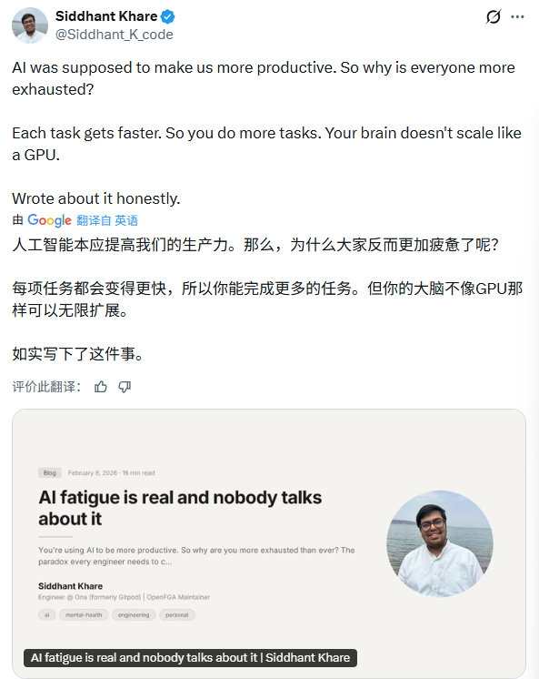 西丹特·卡雷(Siddhant Khare)是一位在博客中详细记录这一过程的软件工程师。他在《AI疲劳是真实存在的》一文中写道,自己上一个季度的代码交付量达到职业生涯峰值,但精神上的疲惫同样被拉满。