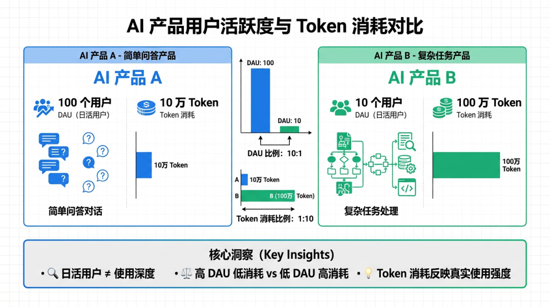 然后另一款AI产品B,每天只有10个用户打开并使用,但他们是用来做复杂任务处理并完成工作流,总共消耗Token数是100万。