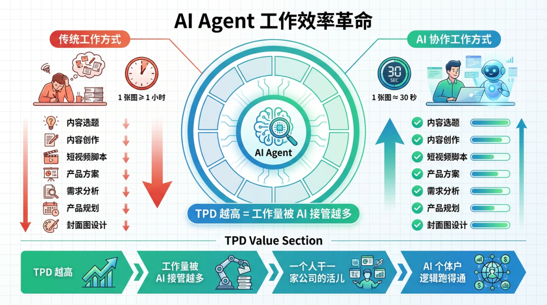 我的TPD越高,说明过去需要我自己完成的工作量都在被AI接管,我才能真正实现一个人干一家公司的活儿。