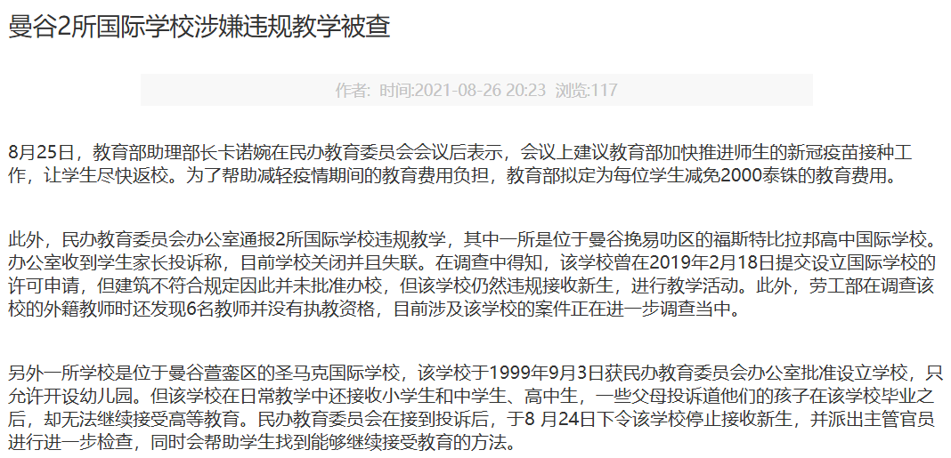 比如2021年泰国民办教育委员会办公室,就通报了2所国际学校违规教育的案例,其中一所是只取得了开设幼儿园的资格,却违规接受了小学生、中学生、高中生,导致这些孩子在毕业之后无法继续接受高等教育。