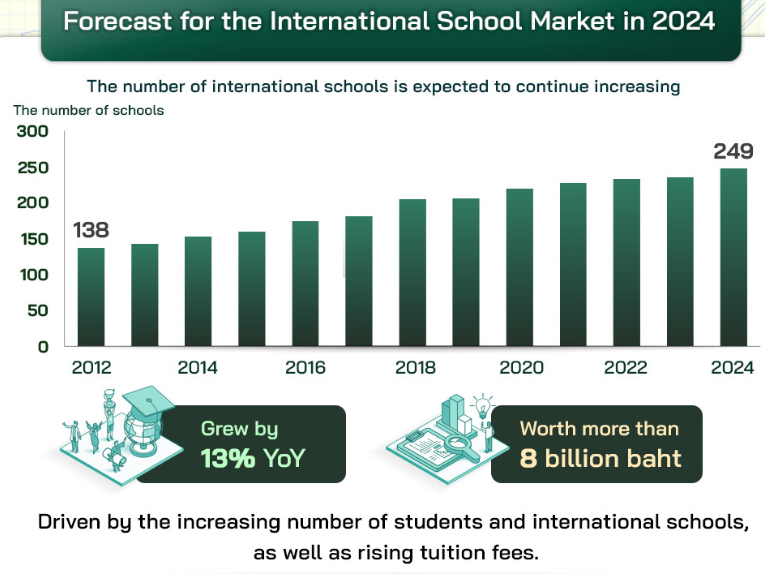 在2012~2024年的这12年里,泰国国际学校数量年均增加5.0%,截至2024年已有近250余所。