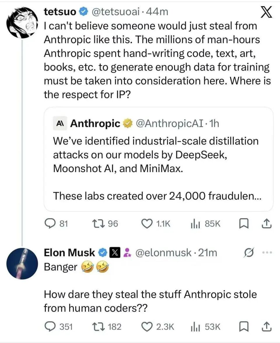 Anthropic给中国大模型贴“抄袭”的标签,社交网络上却出现了不同的声音。马斯克在X上转发用户评论时调侃,“他们竟敢‘偷窃’Anthropic从人类程序员那里偷走的东西?”