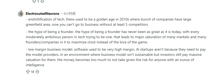 正如一位Riddit网友评道:市场正陷入“内卷粪化”,十年前处处蓝海,如今每个赛道都挤满对手。创始人头衔成为泡沫,人人创业只为刷估值、博影响力,而非真心做事。AI初创公司困于低利润模式,需要向模型商交租,商业模式本身难以为继。但当热钱仍在疯狂追逐,面对眼前唾手可得的巨额现金和有限风险,理性人谁会拒绝套现离场?