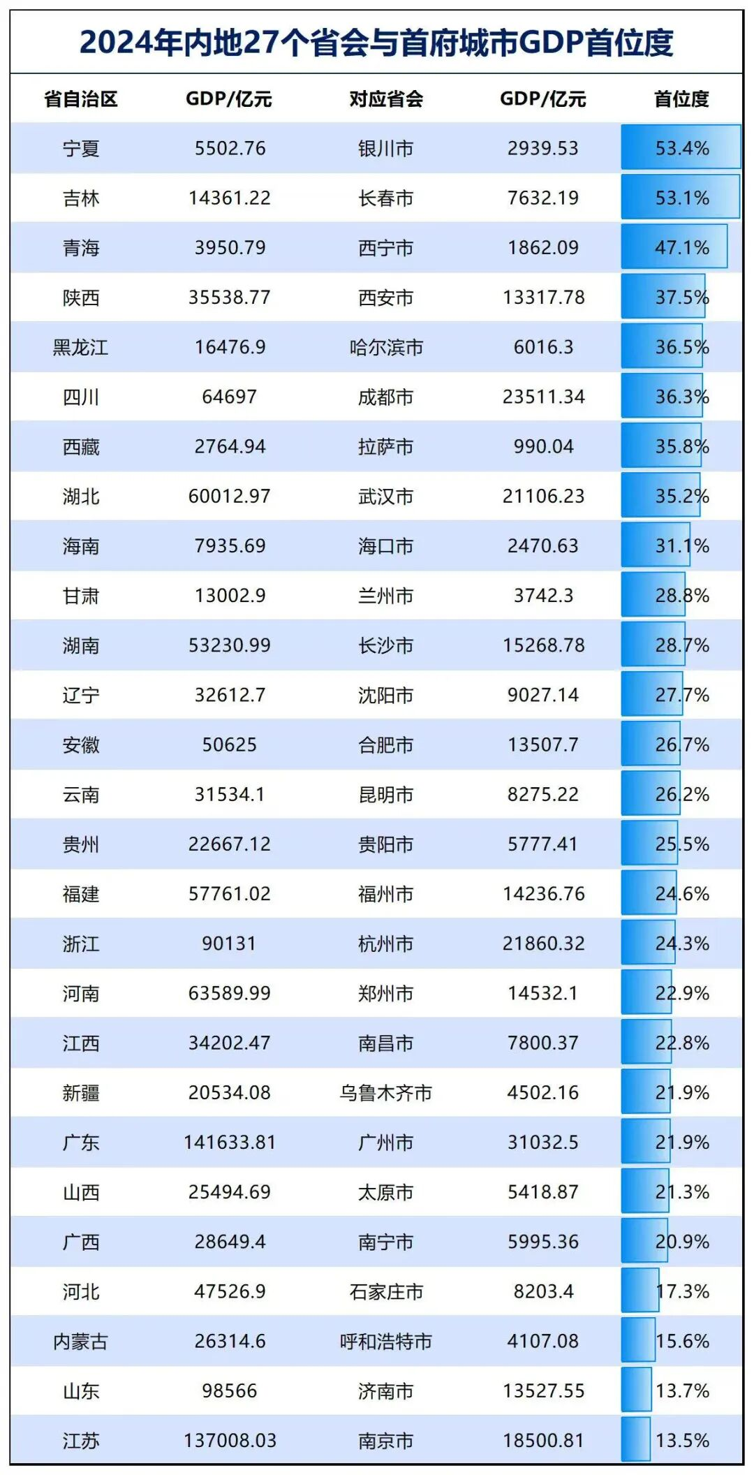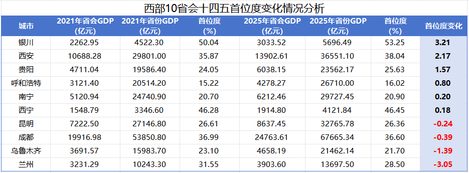 例如,按此指标,银川、长春、西宁的“首位度”最高,其GDP占全省比重接近或超过一半。