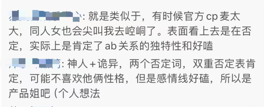 还有一些极具迷惑性的“辱追”发言:比如,大叫“AB这俩神人的关系真特别诡异”的,不一定是对家,可能是磕AB的CP粉。